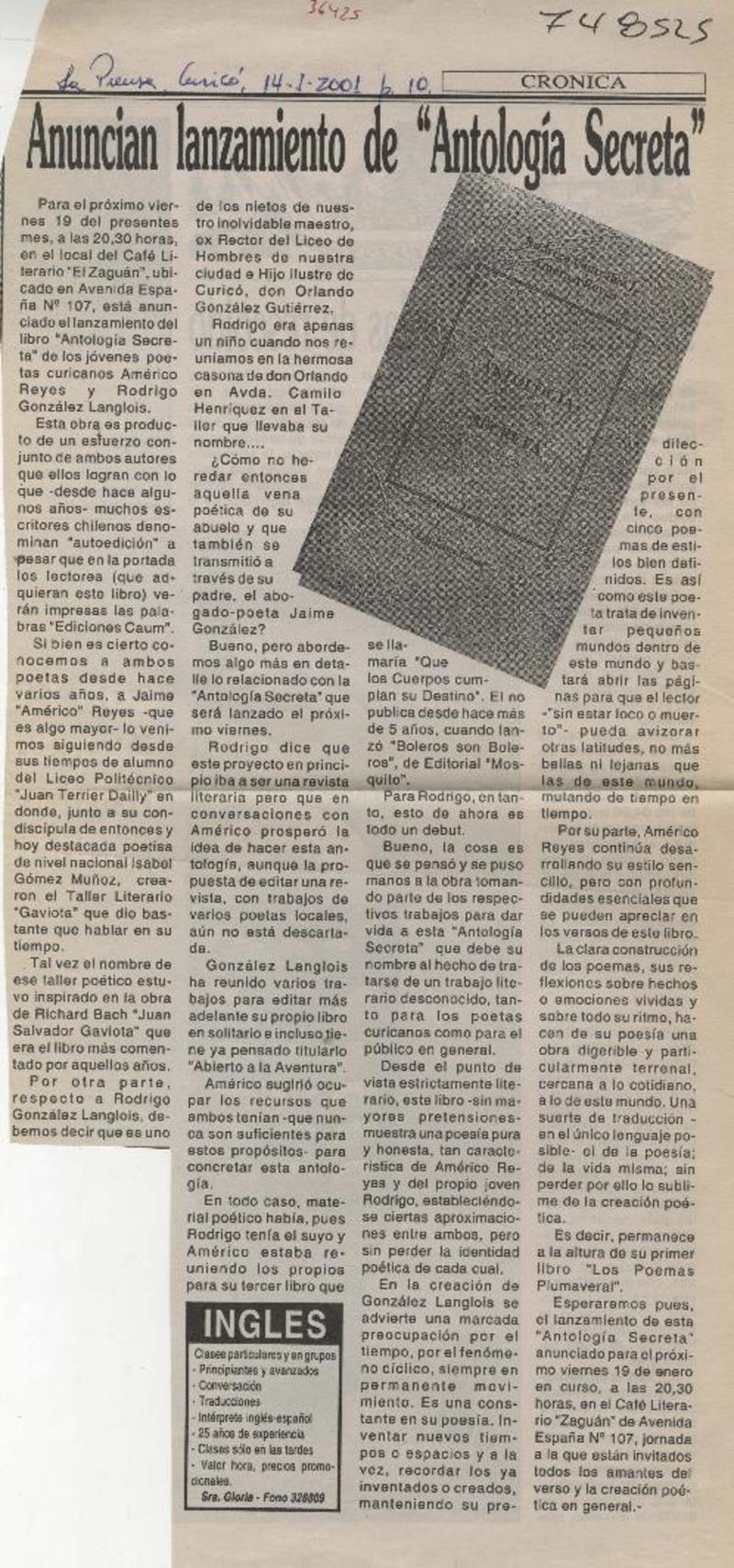 Anuncian lanzamiento de "Antología secreta". [artículo]