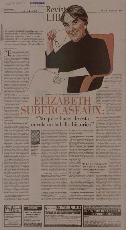 Elizabeth Subercaseaux : "no quise hacer de esta novela un ladrillo histórico" [entrevista] [artículo] María Teresa Cárdenas.