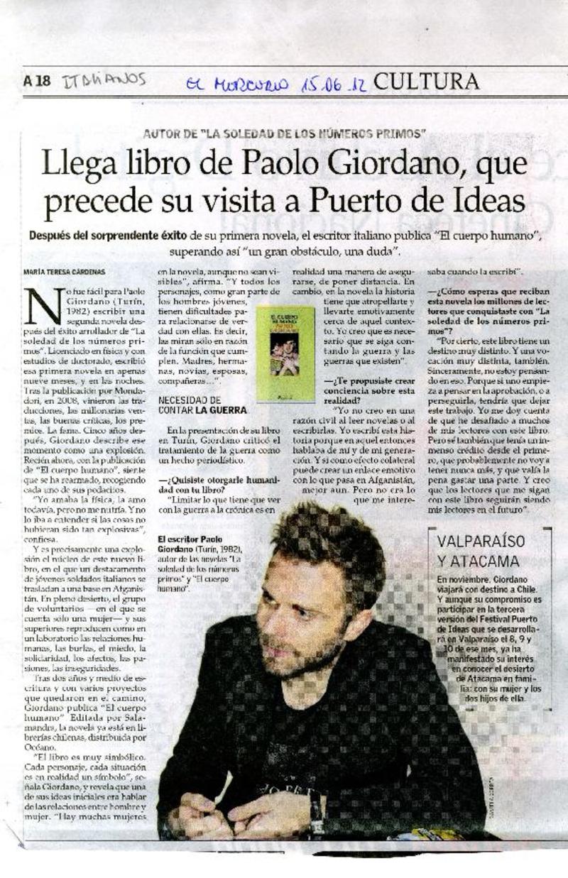 Llega libro de Paolo Giordano, que precede su visita a puerto de ideas [artículo] María Teresa Cárdenas.