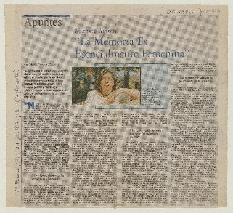 "La memoria es esencialmente femenina" [artículo] María Teresa Cárdenas.