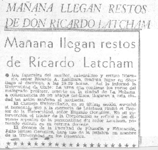 Mañana llegan restos de don Ricardo Latcham [artículo]