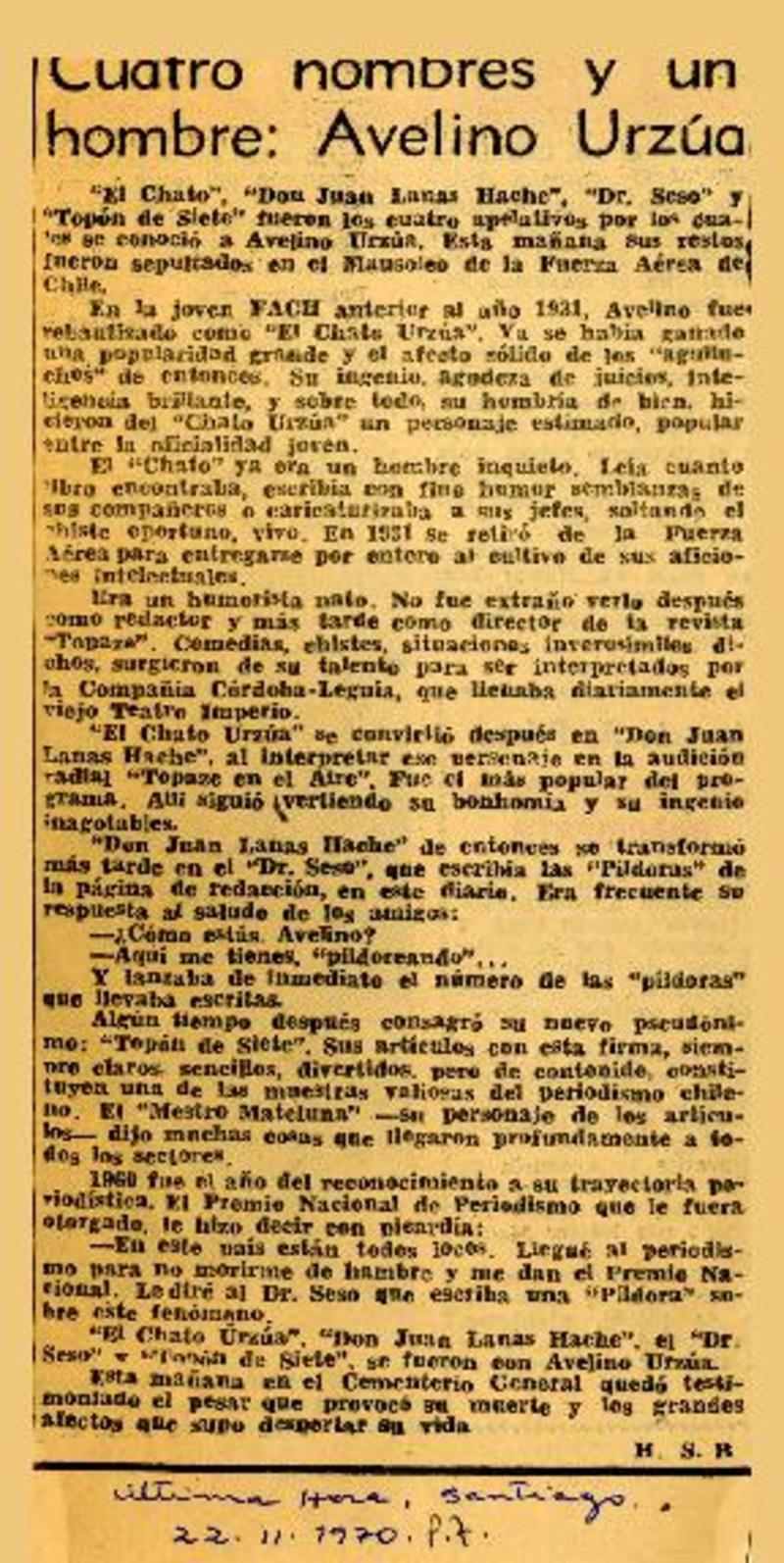 Cuatro nombres y un hombre: Avelino Urzúa [artículo] H. S. R.