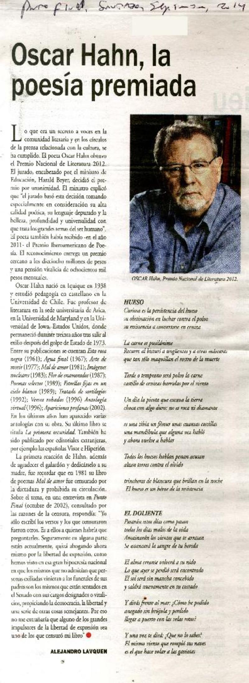 Oscar Hahn, la poesía premiada [artículo] Alejandro Lavquen