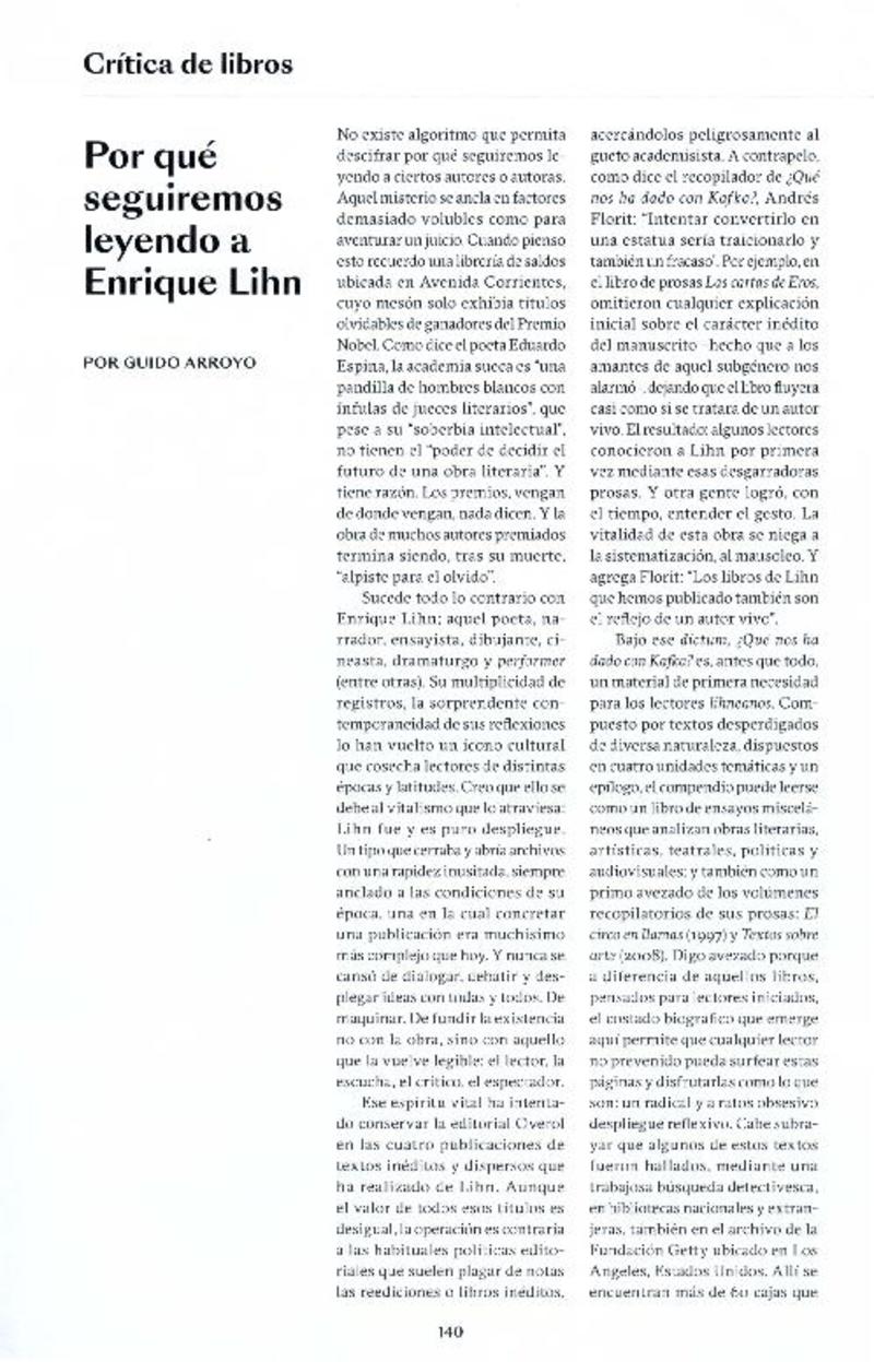 Por qué seguiremos leyendo a Enrique Lihn [artículo] Guido Arroyo.