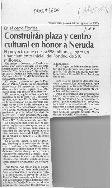 Construirán plaza y centro cultural en honor a Neruda [artículo].