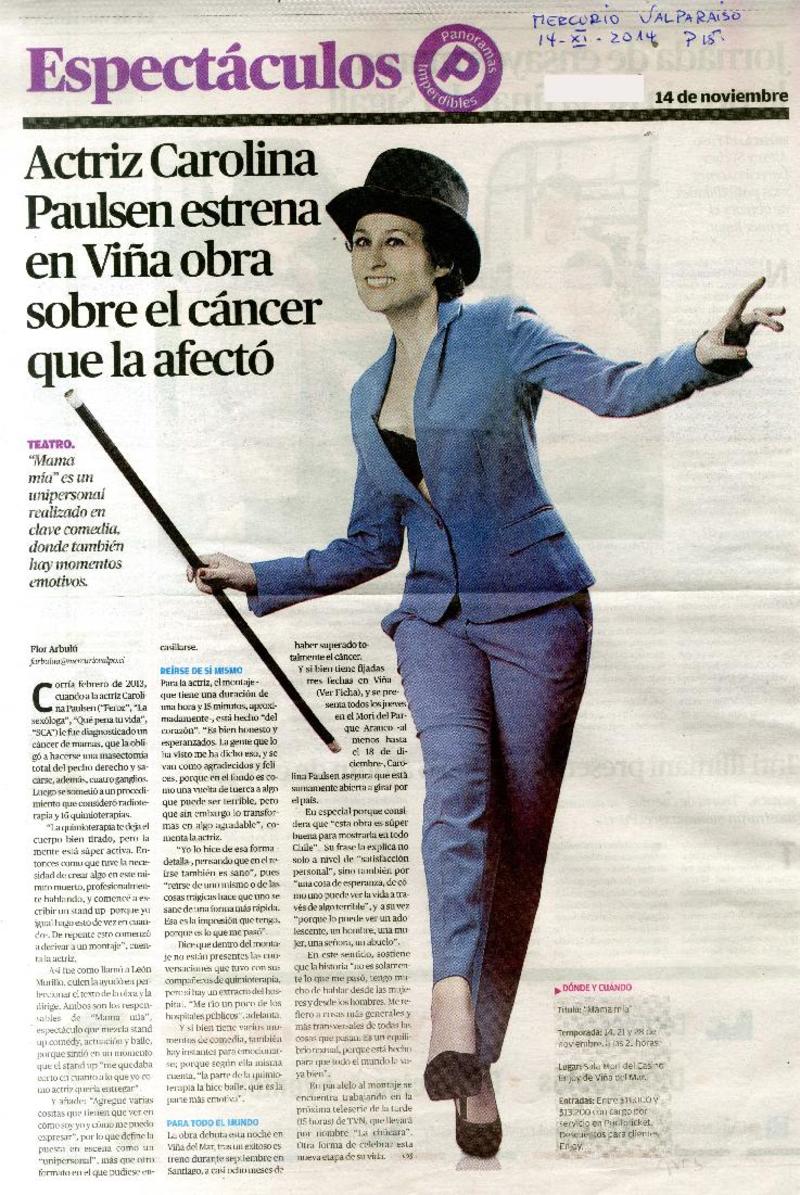 Actriz Carolina Paulsen estrena en Viña obra sobre el cáncer que le afectó [artículo] Flor Arbulú