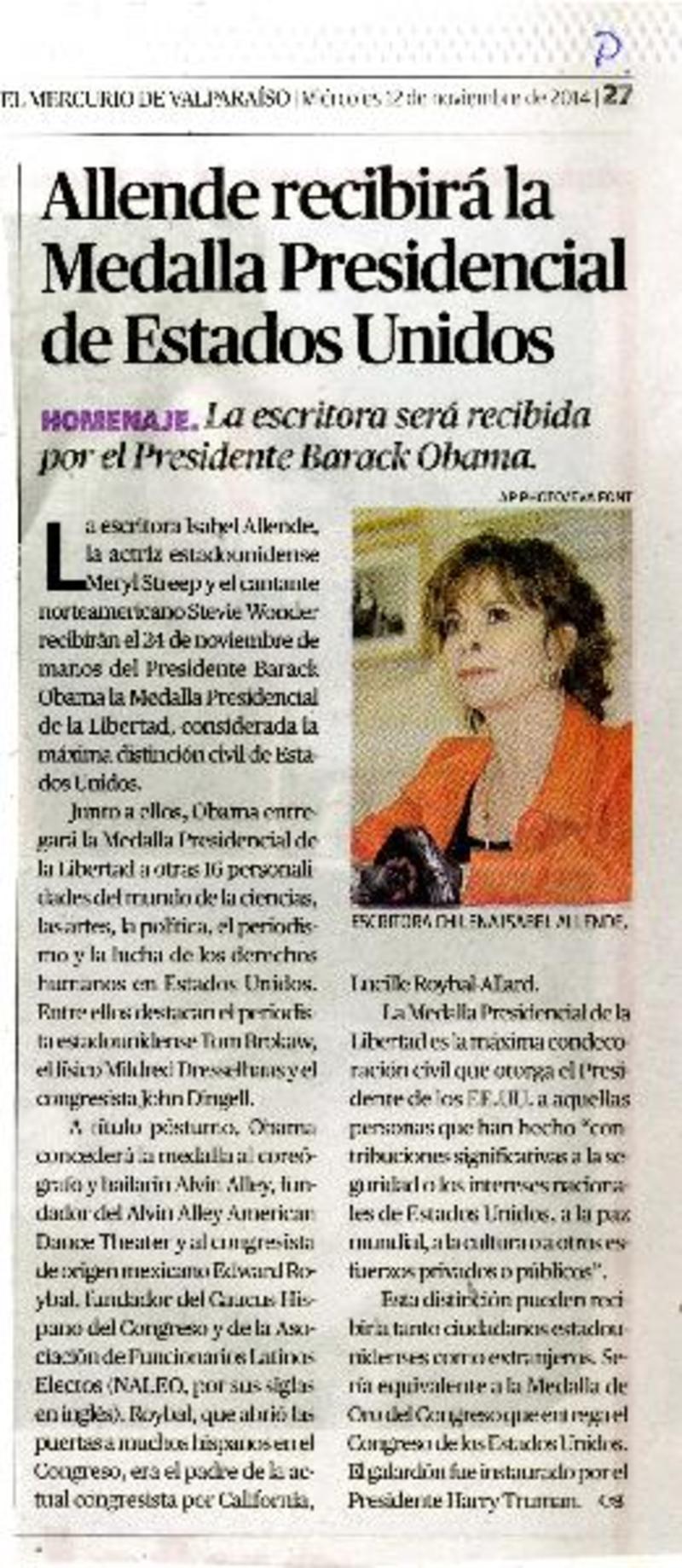 Allende recibirá la Medalla Presidencial de Estados Unidos [artículo].