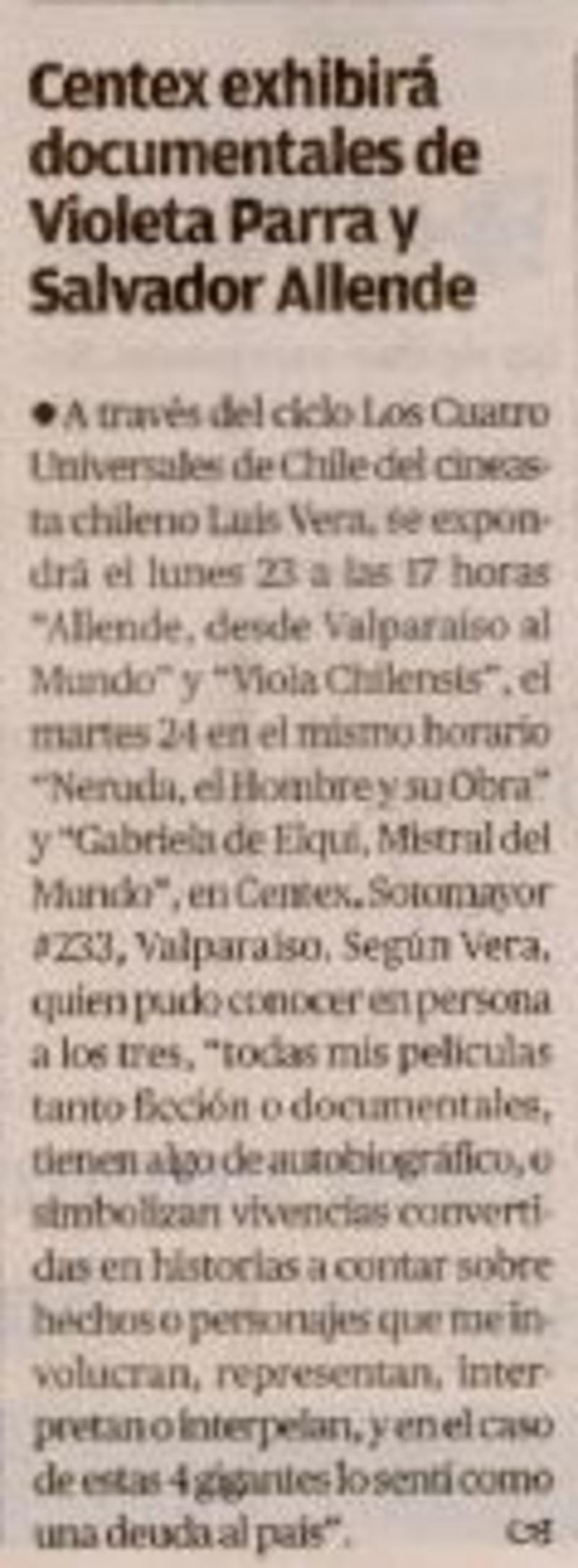 Centex exhibirá documentales de Violeta Parra y Salvador Allende [artículo].