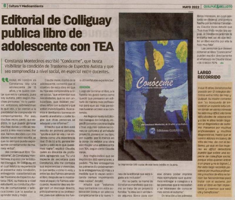 Editorial de Colliguay publica libro de adolescente con TEA [artículo].