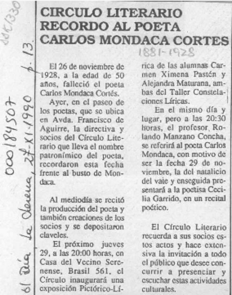 Recuerdan 100 años del nataliciio del poeta Carlos Mondaca Cortés. [artículo]