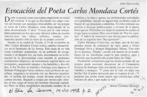 Evocación del poeta Carlos Mondaca Cortés [artículo] María Cristina Menares.