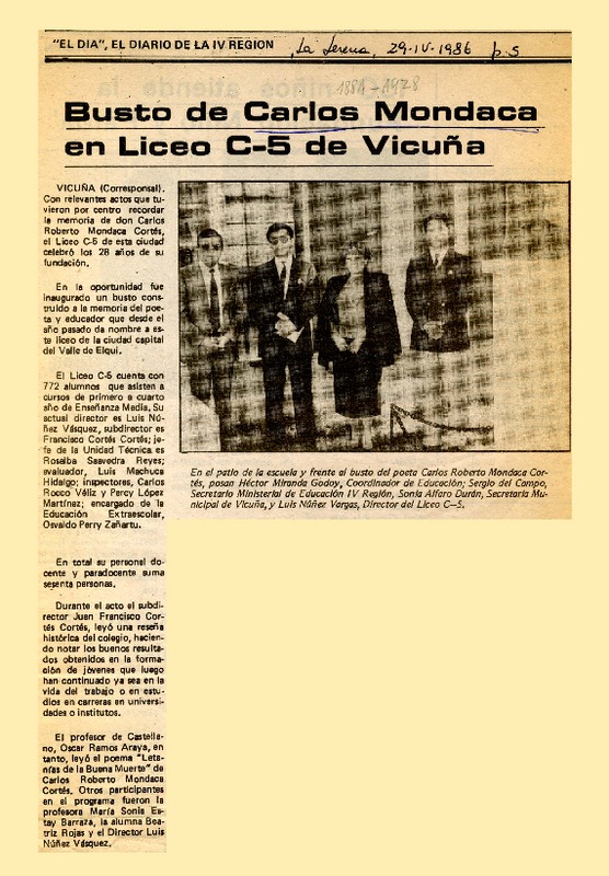 Busto de Carlos Mondaca en Liceo C-5 de Vicuña [artículo].