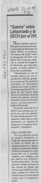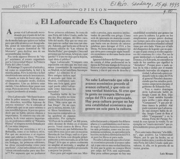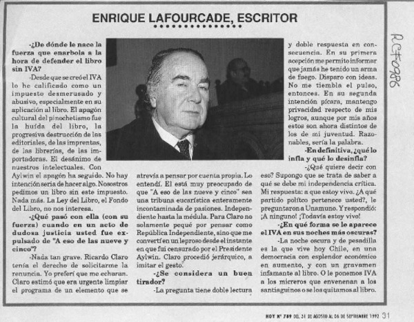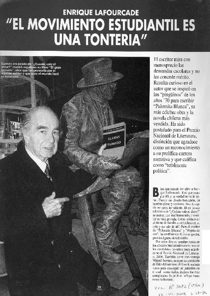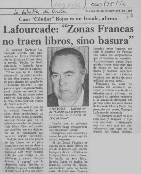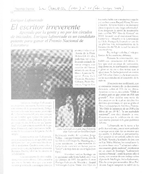 Una polémica permanente : el IVA a los libros : el escritor Enrique Lafourcade nos entrega poderosas razones a favor de la eliminación del IVA y el editor y escritor Alfredo Gaete, la otra cara de la moneda : [entrevista] [artículo] A. M.