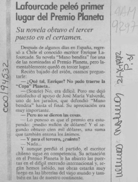 Ultima novela de Lafourcade [artículo].