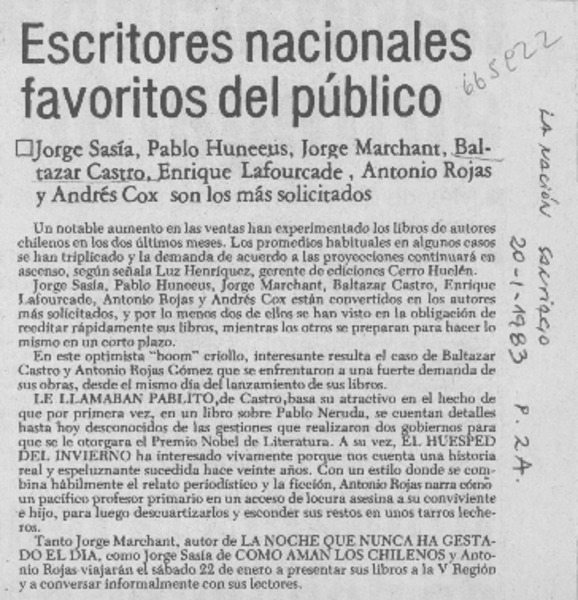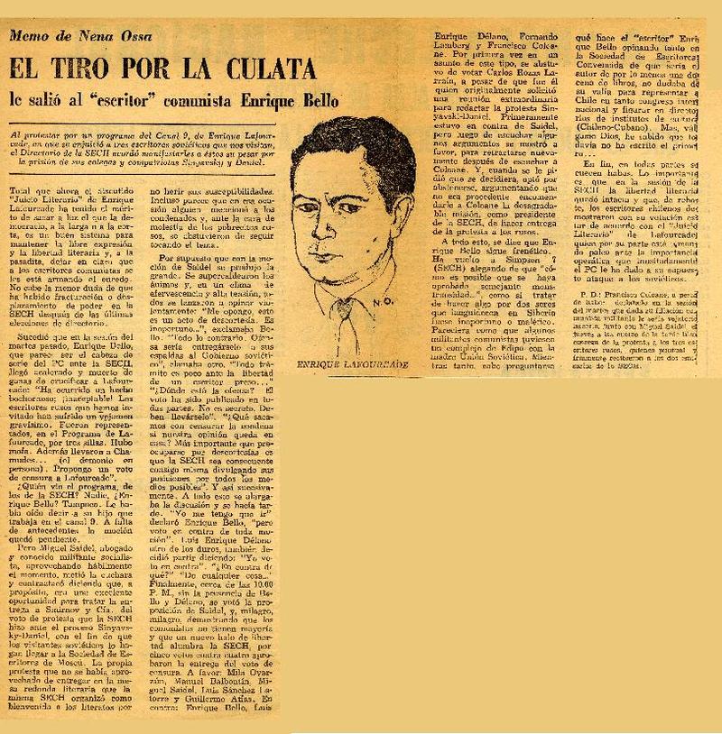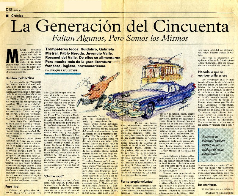 Arenas, Braulio - Délano, Luis Enrique - Belmar, Daniel - Autores chilenos - Neruda, Pablo - Lafourcade, Enrique - Bombal, María Luisa