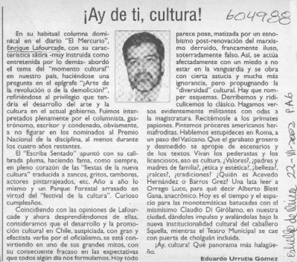 ¡Ay de ti, cultura! [artículo] Eduardo Urrutia Gómez