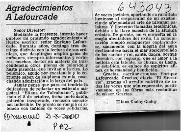 Agradecimientos a Lafourcade [artículo] Eliana Godoy Godoy