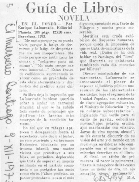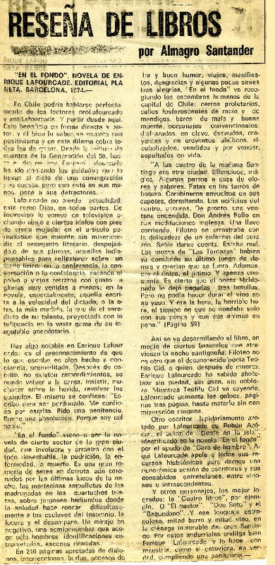 Santiago en una novela de Enrique Lafourcade [artículo] Carlos Morand.