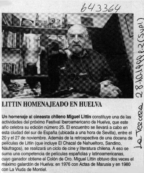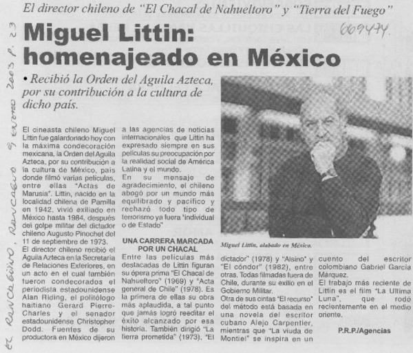 Miguel Littin, "Existe una imagen muy estereotipada de mí" [artículo] Alberto Fuguet [y] René Naranjo.