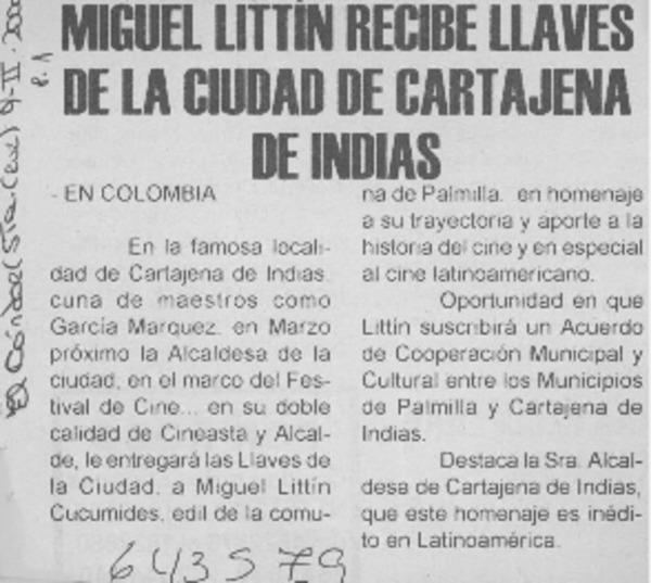 Miguel Littin recibe llaves de la ciudad de Cartagena de Indias. [artículo]