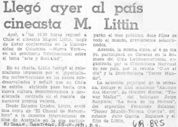 Llegó ayer al país cineasta M. Littin. [artículo]