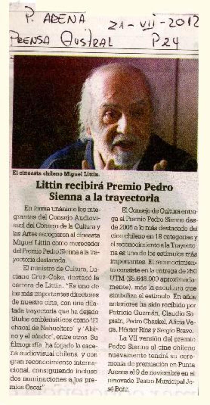 Littin recibirá premio Pedro Sienna a la trayectoria. [artículo]