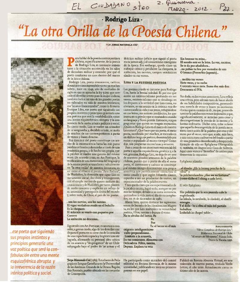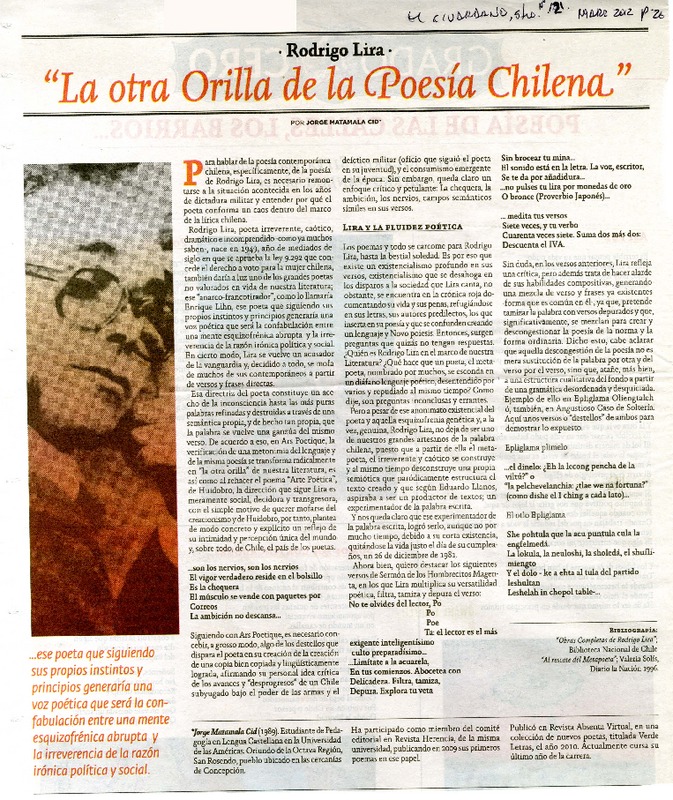 El rasguñón letal del poeta Rodrigo Lira [artículo] Yanko González Cangas.