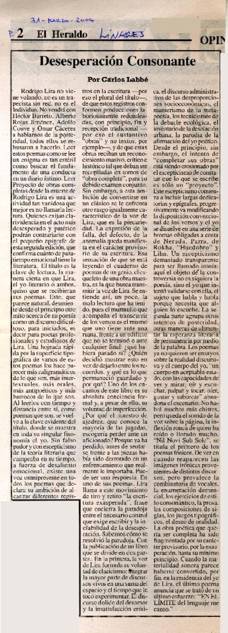 Desesperación consonante [artículo] Carlos Labbé.