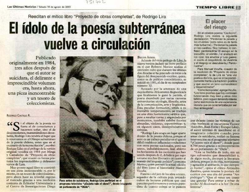 El ídolo de la poesía subterránea vuelve a circulación [artículo] Rodrigo Castillo R.