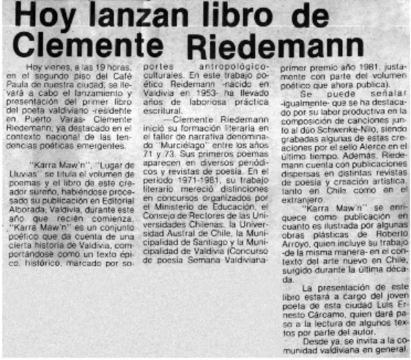 Hoy lanzan libro de Clemente Riedemann. [artículo]