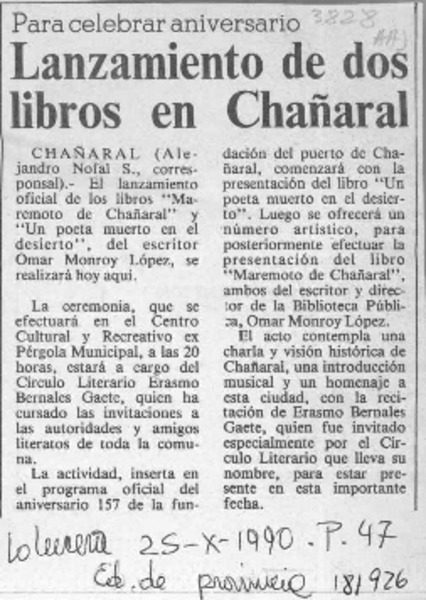 Aniversario de Chañaral y lanzamiento de libros [artículo] Oriel Alvarez Gómez.