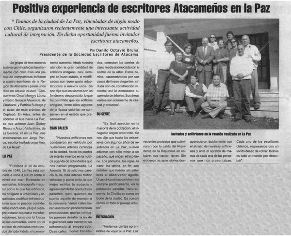 Positiva experiencia de escritores atacameños en La Paz [artículo] Danilo Octavio Bruna .