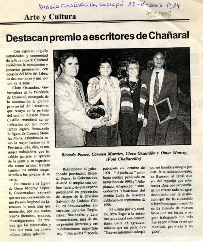 Cuatro destacados escritores de Atacama recibieron galardón [artículo]