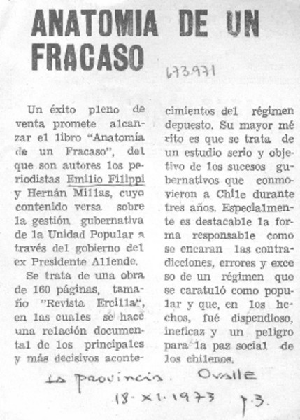 Autores chilenos - Millas, Hernán - Filippi, Emilio - Anatomía de un fracaso