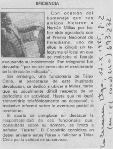 Jorge Millas elegido Premio Nacional de Periodismo 1985. [artículo]