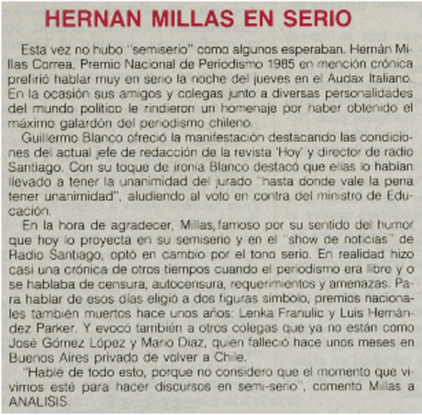 Homenaje a Millas, Premio Nacional de Periodismo. [artículo]