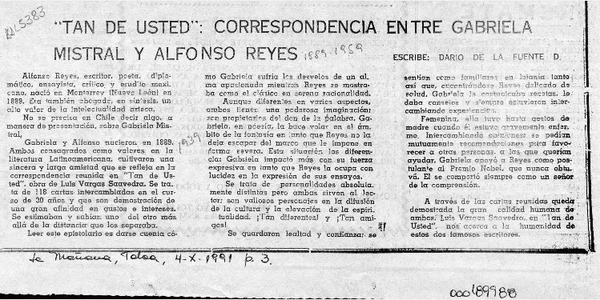 "Tan de usted", correspondencia entre Gabriela Mistral y Alfonso Reyes [artículo] Darío de la Fuente D.