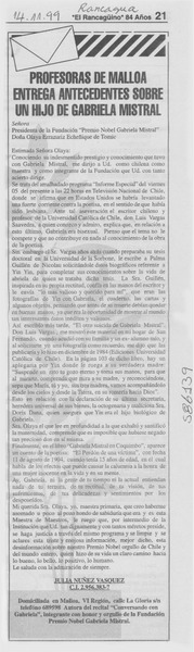 Profesora de Malloa entrega antecedentes sobre un hijo de Gabriela Mistral [artículo] Julia Núñez Vásquez