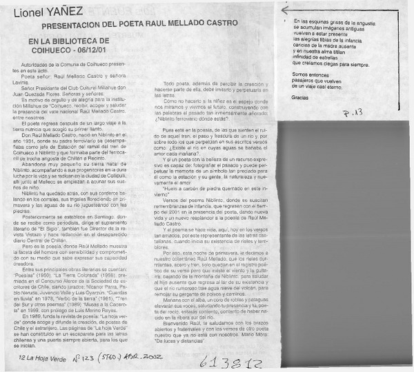 Presentación del poeta Raúl Mellado Castro [artículo] Lionel Yañez