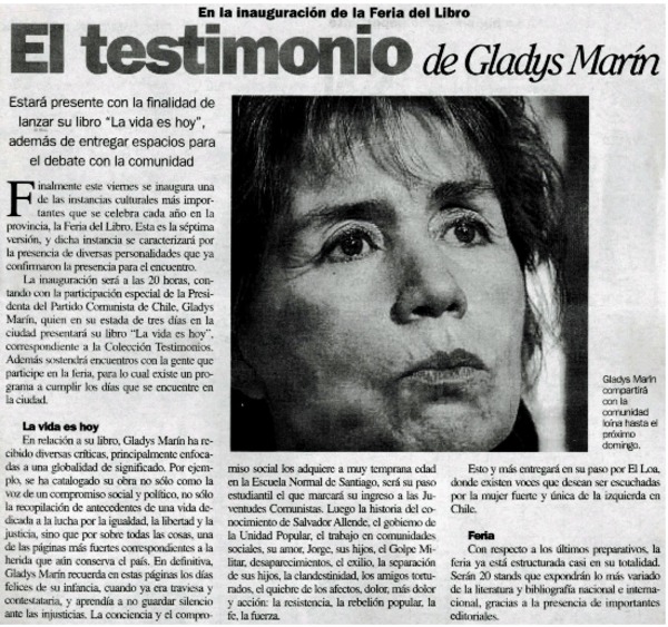 Gladys Marín lanza hoy su libro en San Antonio. [artículo]