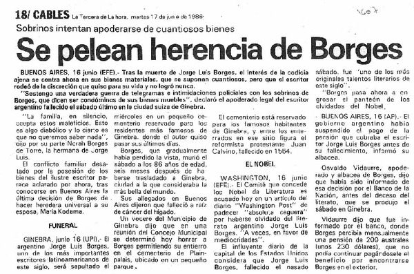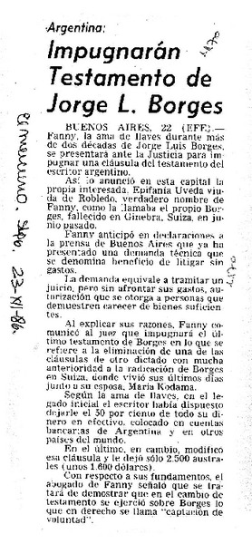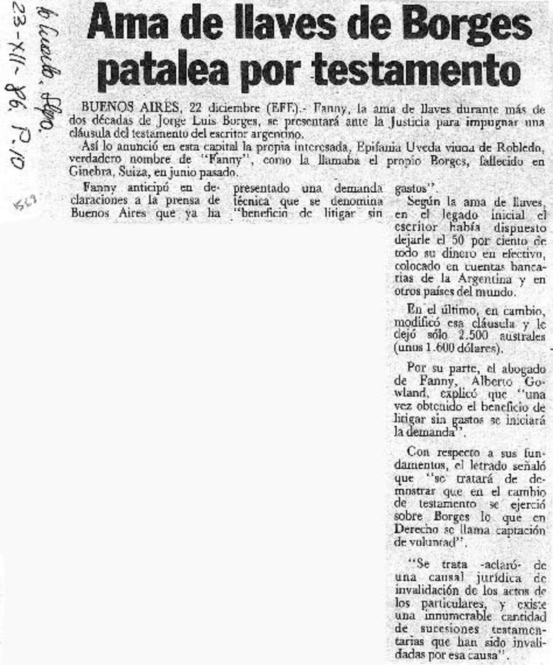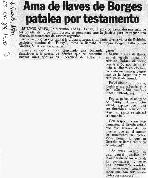 Ama de llavez de Borges patalea por testamento. [artículo]