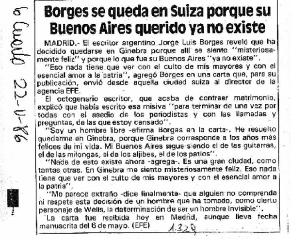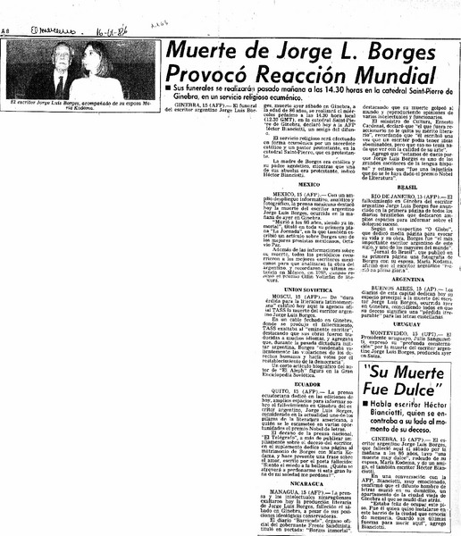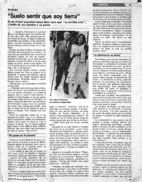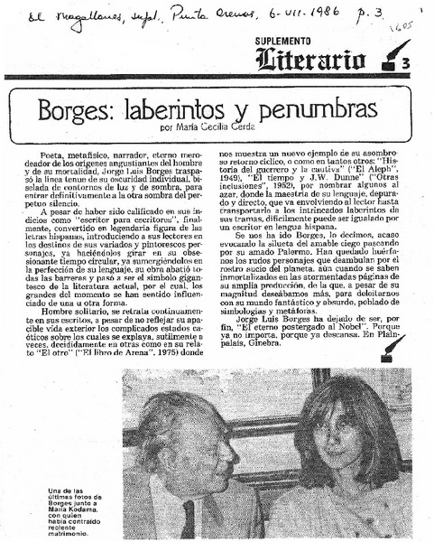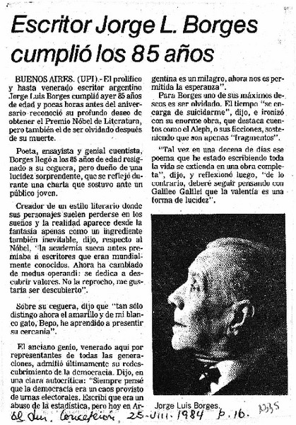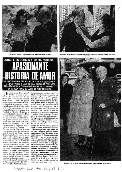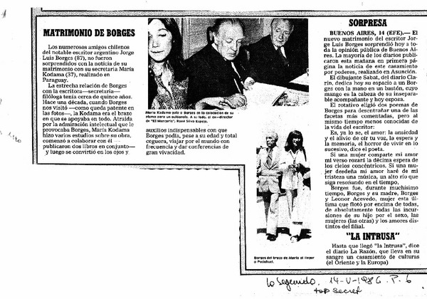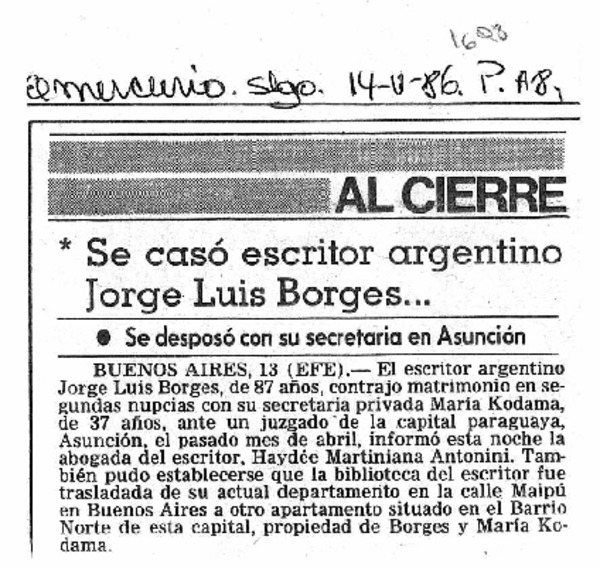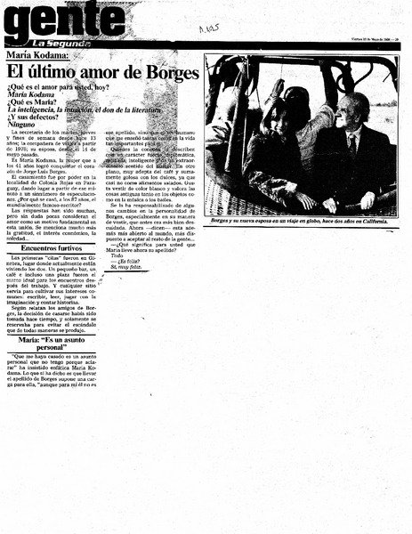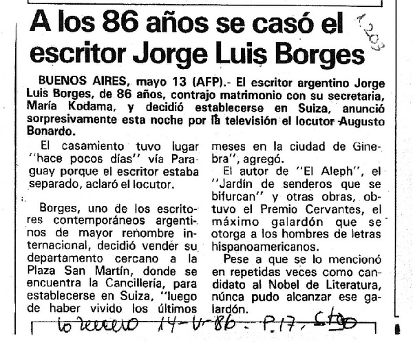 A los 86 años se casó el escritor Jorge Luis Borges. [artículo]