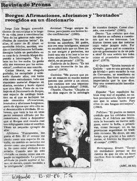 Borges: afirmaciones, aforismos y "boutades" recogidos en un diccionario. [artículo].