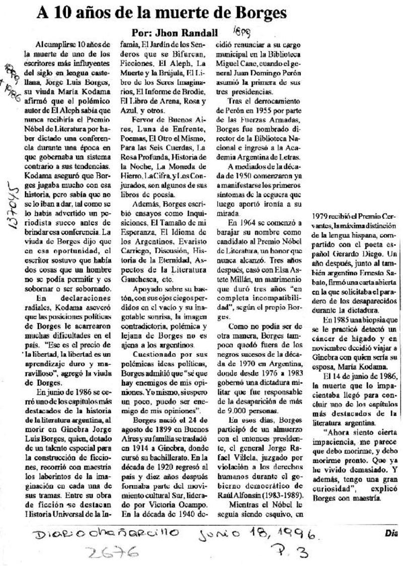 A 10 años de la muerte de Borges [artículo] John Randall.