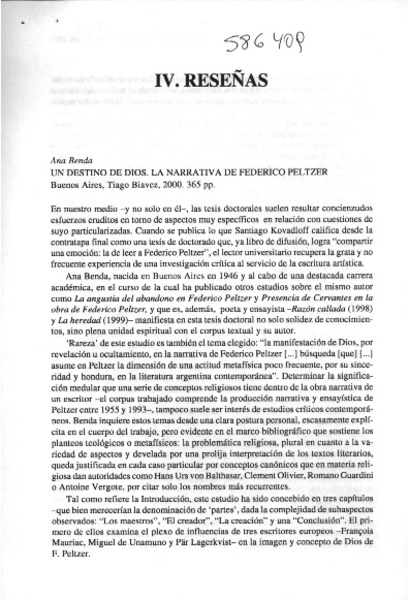 Benda, Ana - Destino de Dios. La narrativa de Federico Peltzer - Autoras argentinas