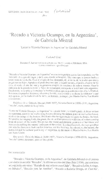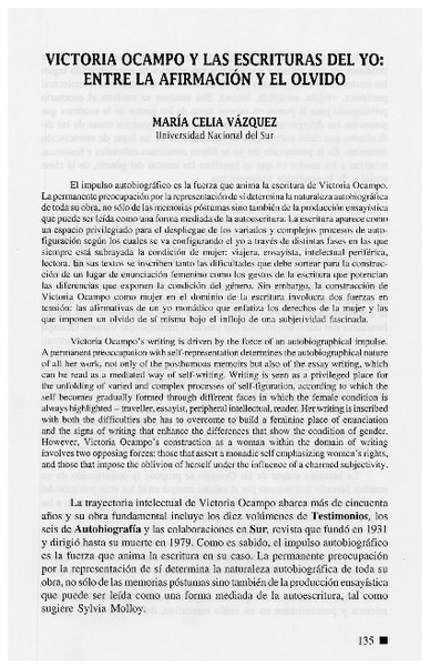 Victoria Ocampo y las escrituras del yo: entre la afirmación y el olvido [artículo] María Celia Vázquez.