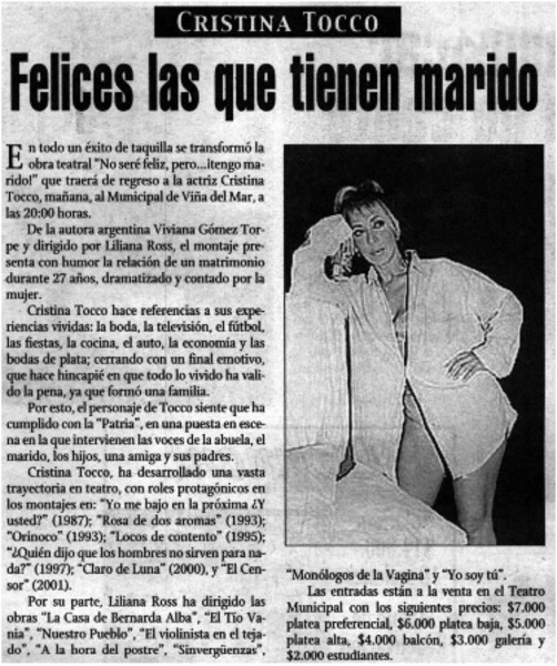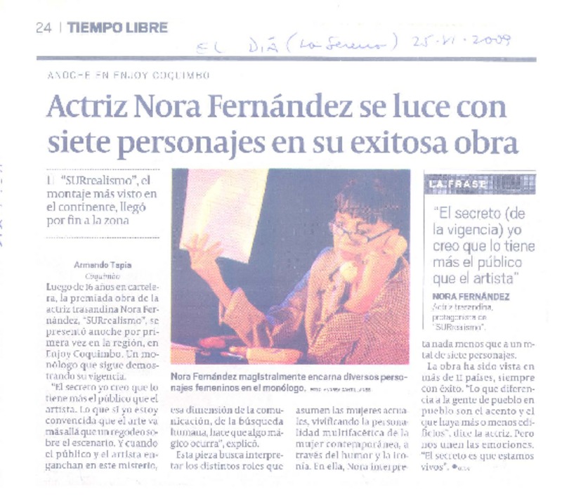 Actriz Nora Fernández se luce con siete personajes en su exitosa obra [artículo] Armando Tapia.