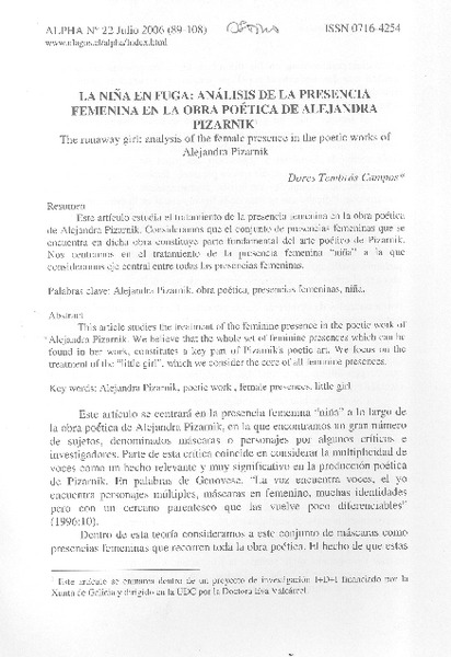 Sujeto pulsional y desidentificado en la poesía de Alejandra Pizarnik [artículo] Cristián Basso.