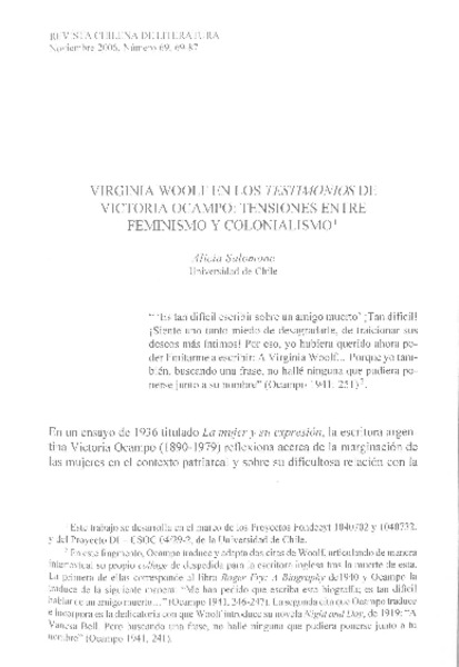 Virginia Woolf en Los testimonios de Victoria Ocampo: tensiones entre feminismo y colonialismo [artículo]Alicia Salomone.