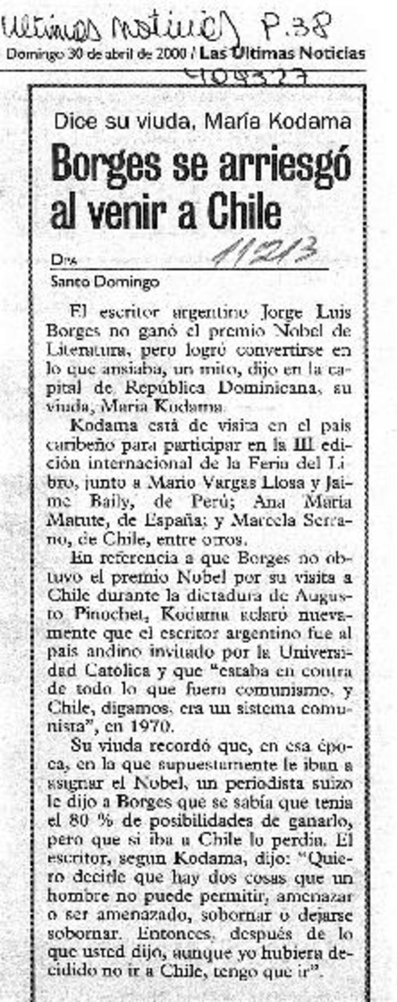 Borges se arriesgó al venir a Chile [artículo] DPA.